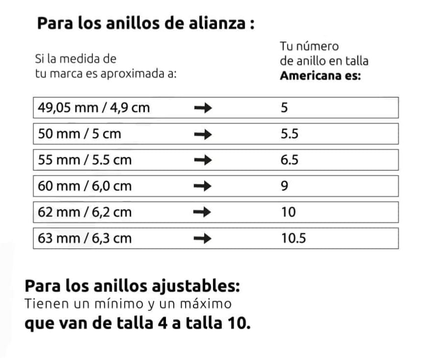 Por último, recuerda revisar en la tabla de las tallas de anillos para conocer cuál es el indicado. Aquí te dejamos una tabla de medidas americana para la talla de tu anillo.