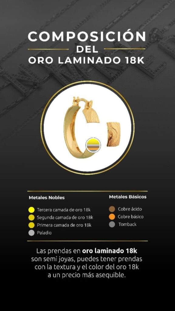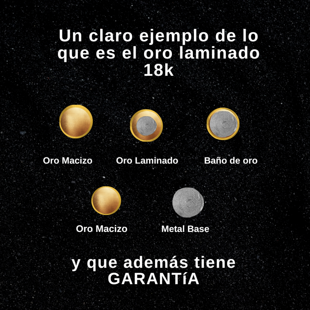 Laminado” se refiere a tres láminas de oro aplicada en un metal que al recubrir toda la superficie se convierte en una lámina gruesa de ORO de 18K, es una base especial fabricada a partir de 2 metales: tombak, y paladium. El Tombak es un metal libre de níquel (todas nuestras joyas están libres de níquel, ya que es un químico que puede producir reacciones alérgicas en la piel) y el Paladium es un metal que permite que el oro se adhiera a la joya, logrando una micro fusión, que junto a la lámina de ORO de 18K, forman un material anti alérgico y de alta resistencia, con el mismo color, textura y brillo del Oro 18K.